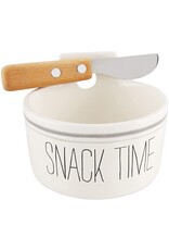 Mud Pie Bistro SNACK TIME Dip Bowl Set. It's snack time and this Eat Up Dip Bowl Set is the star of the show. The two piece set comes with a hand-painted ceramic dip bowl. The dip bowl features a cut-out hole that can hold the included wood and stainless steel spreader. The front of the dish reads "SNACK TIME" in the center..