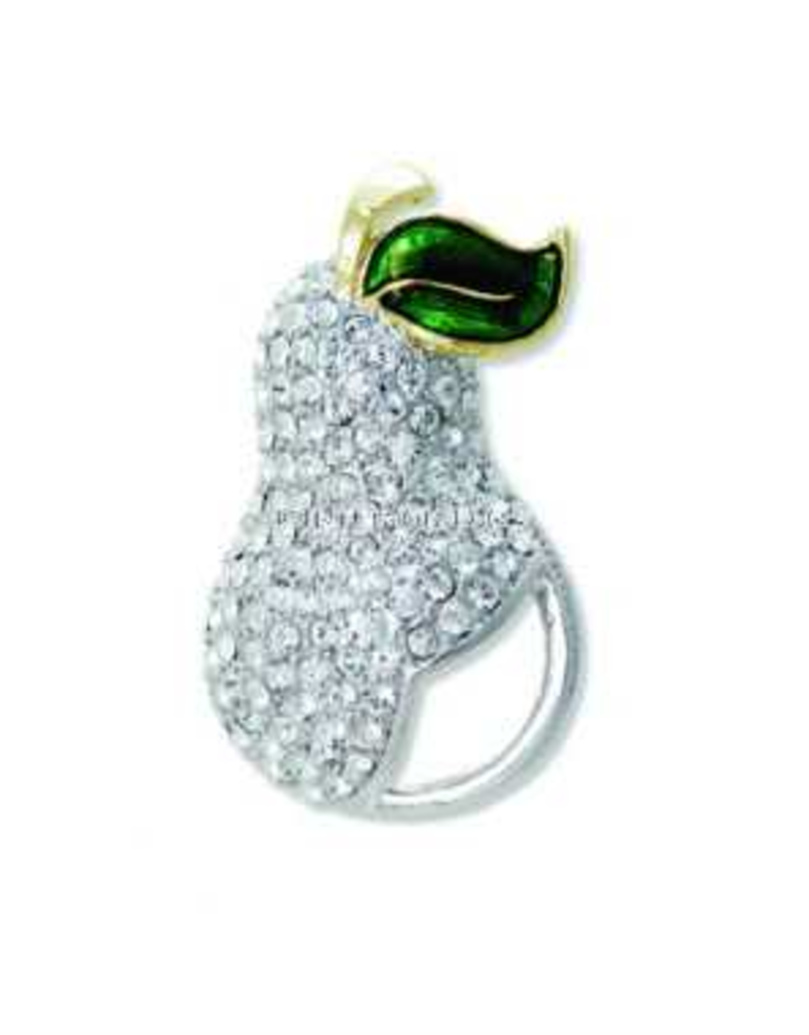 Pear Brooch Magnetic Eyeglasses holder. Size: 1.5L inches. Rhodium gold Peeper's Keepers™ magnetic brooch with green enamel and clear crystals. Wear as brooch or use to Peepers Keep to hold your glasses. Peeper's Keeper ™ in pear shape with clear crystals. High quality fashion Jewelry platted with 22K Gold and/or Rhodium on a Pewter Base (Rhodium is a member of the Platinum Family) Hypo Allergenic - Nickle Free - Made with Swarovski ™ Crystal.