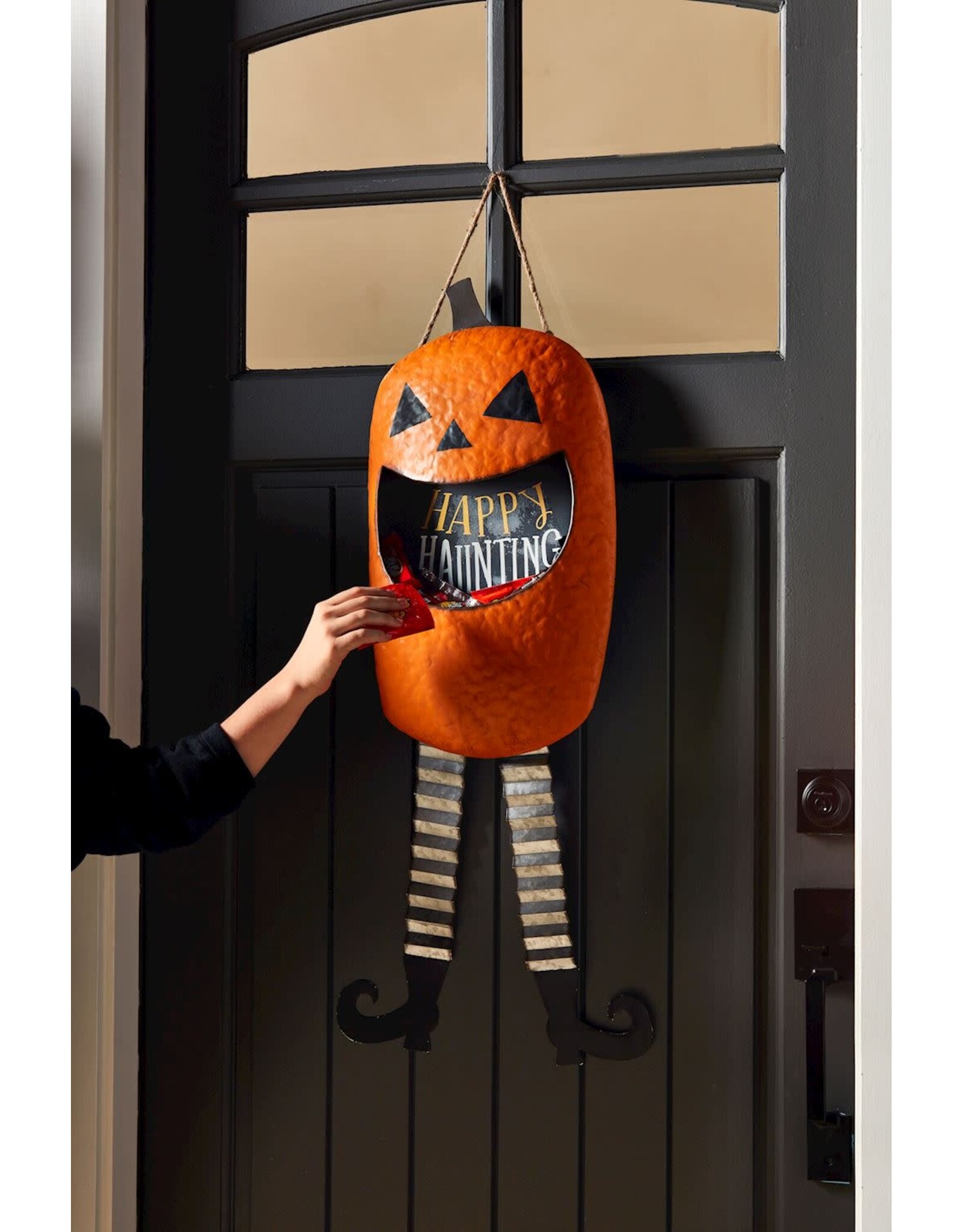Mud Pie Halloween Tin Jack-O-Lantern Candy Bucket Door Hanger 33 Inch. Corrugate tin door hanger features open mouth bucket to hold candy. Perfect for trick-or-treaters!