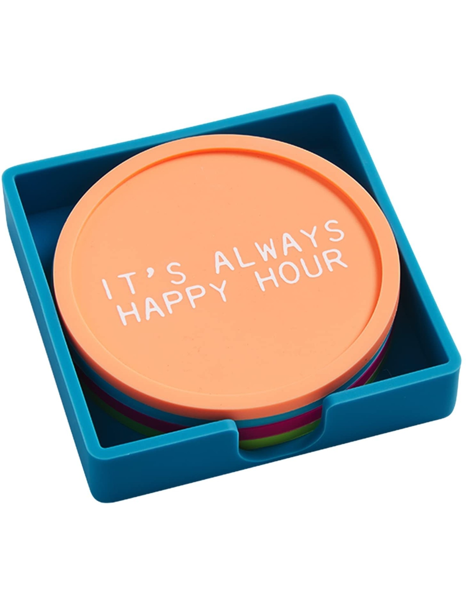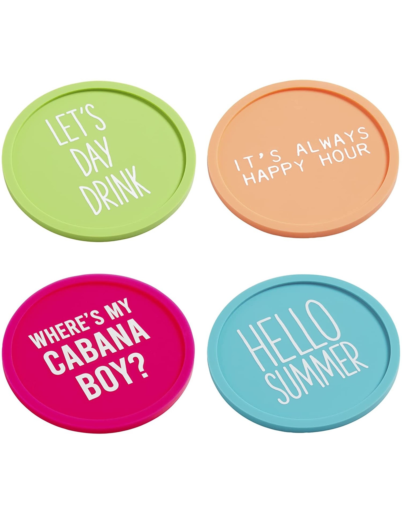 Mud Pie Pool Silicone Coasters Set of 4 Assorted Sayings. Make a splash with our Pool Silicone Coaster Set. The five piece set comes with a set of four silicone coasters. The coasters sit in a caddy that reads "Always on Vacay". The coasters feature the sentiments "hello summer", "it's always happy hour", "where's my cabana boy" and "let's day drink".
